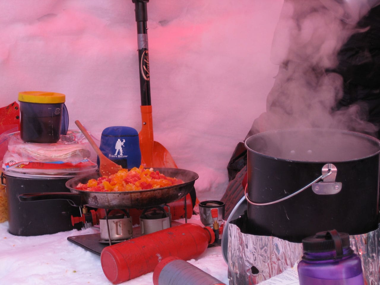 Speaking of tomorrow, weather permitting, we'll be doing a carry up Motorcycle Hill and past Windy Corner. Thankfully, today ends our use of snowshoes ("slow shoes") and sleds. It's all just crampons and packs from here on.
