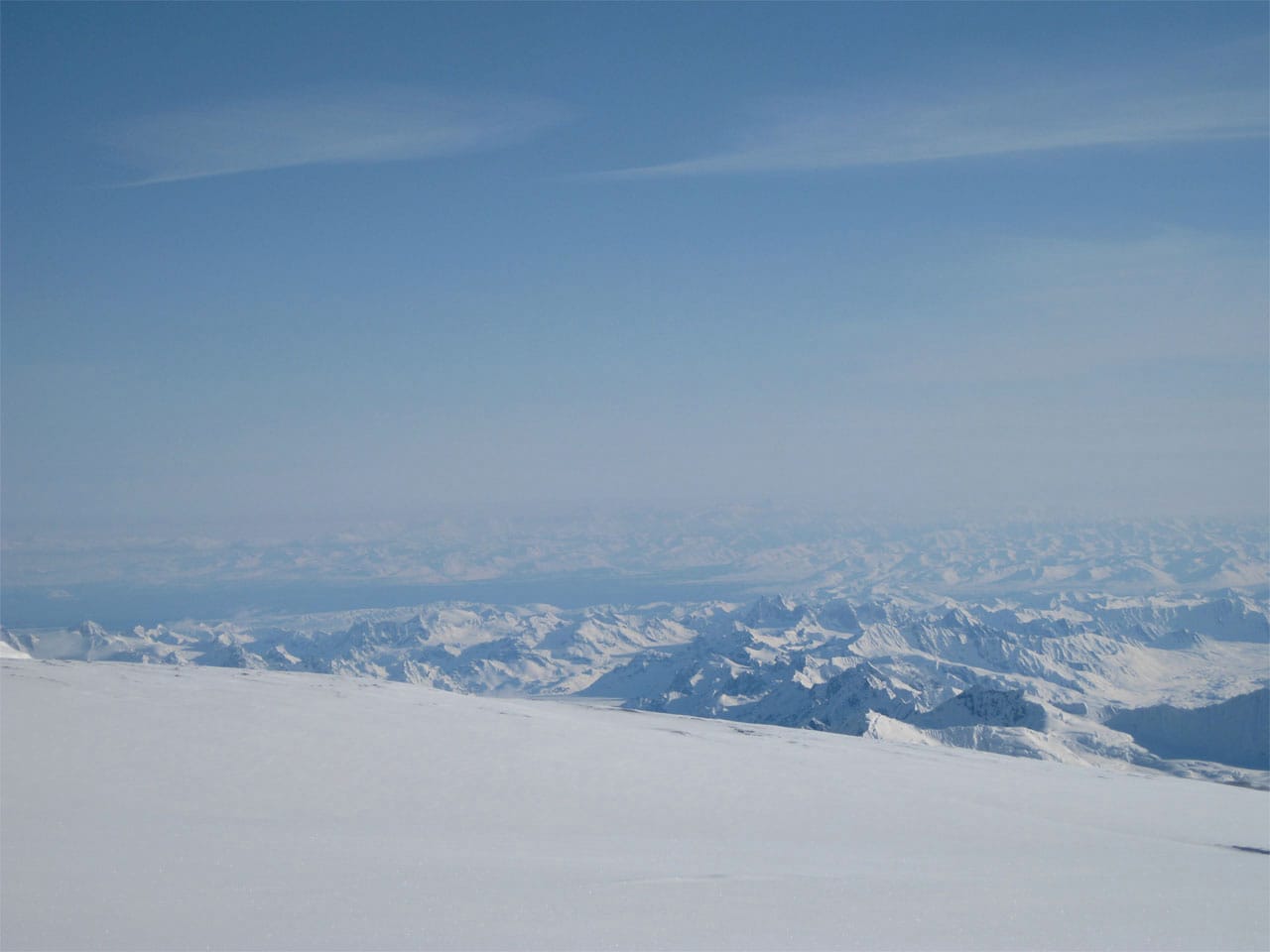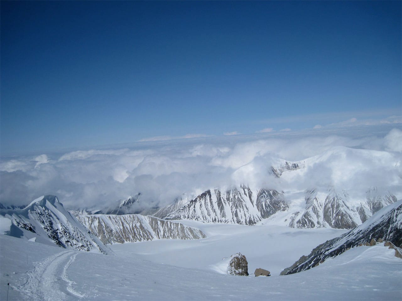 From my present vantage point I can see the path to Camp 5 - which goes up some two thousand feet (that we can see from here) and it looks like its bloody straight up. It's called the headwall and it looks like going down is much more fun that going up. At parts, I'm told, it's a fifty degree slope, but that's the worst of it, and that part is on fixed lines. From here I can also see Mt. Foraker and Hunter, clouds to the right of Foraker and endless mountains between the two peaks as far as I can see.