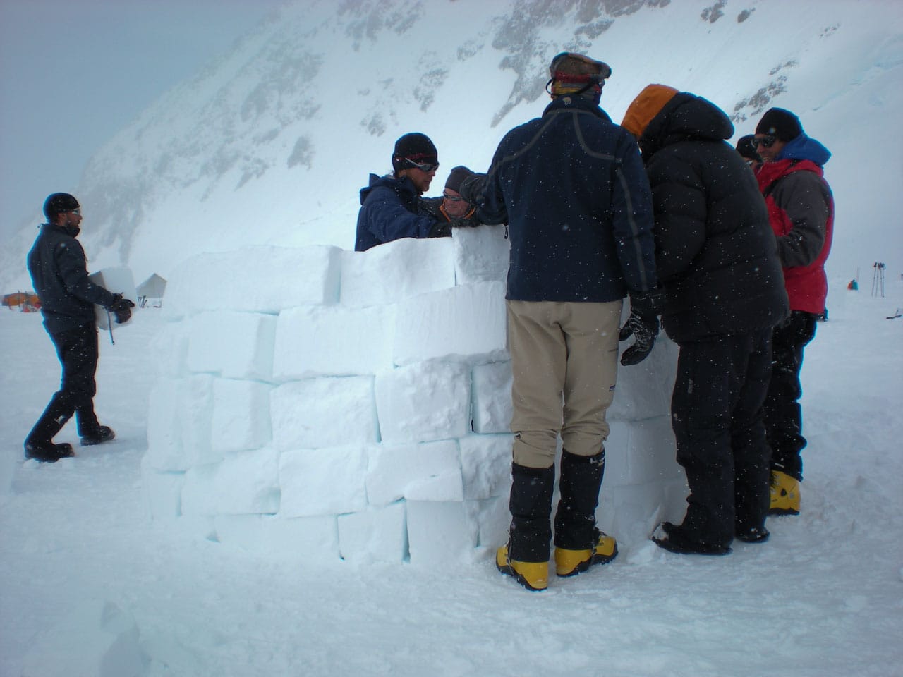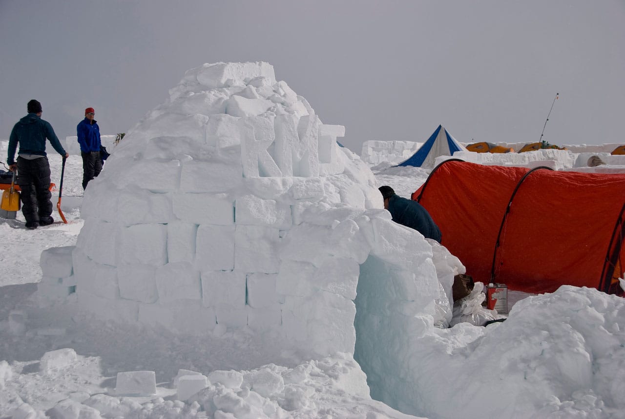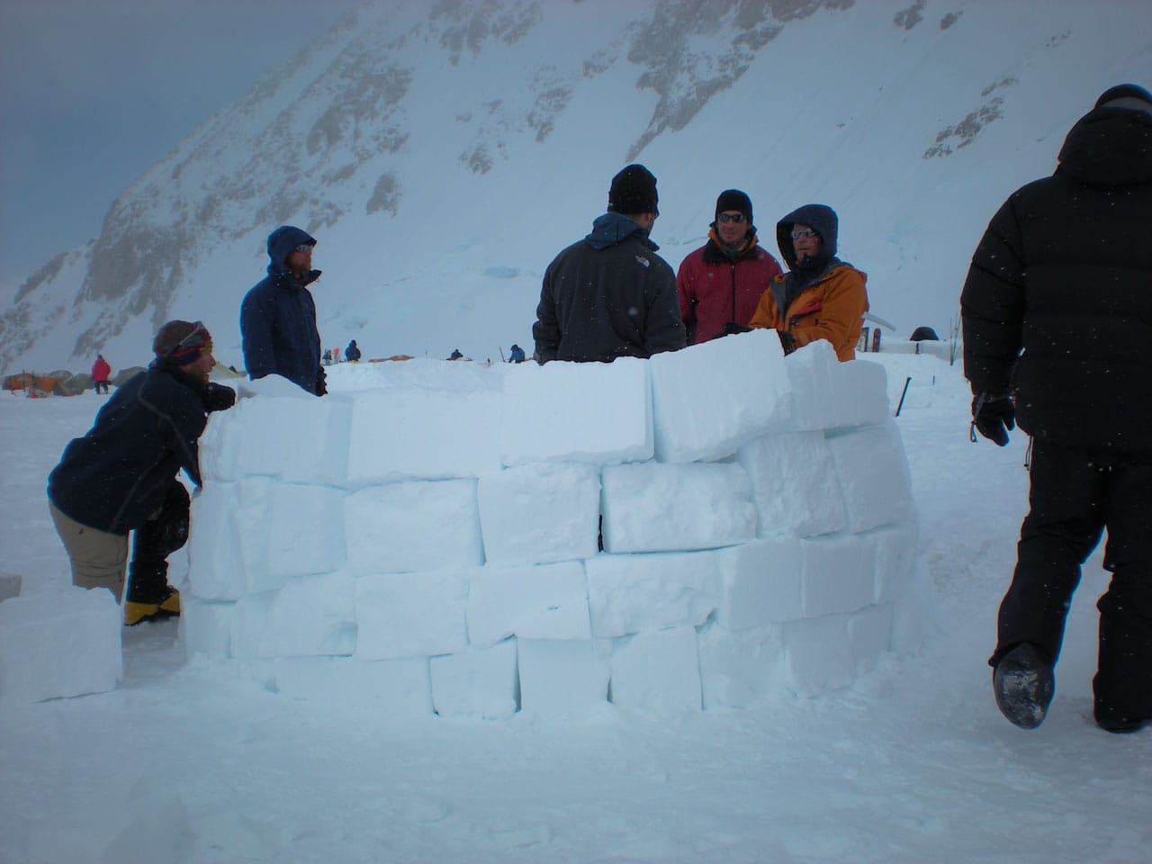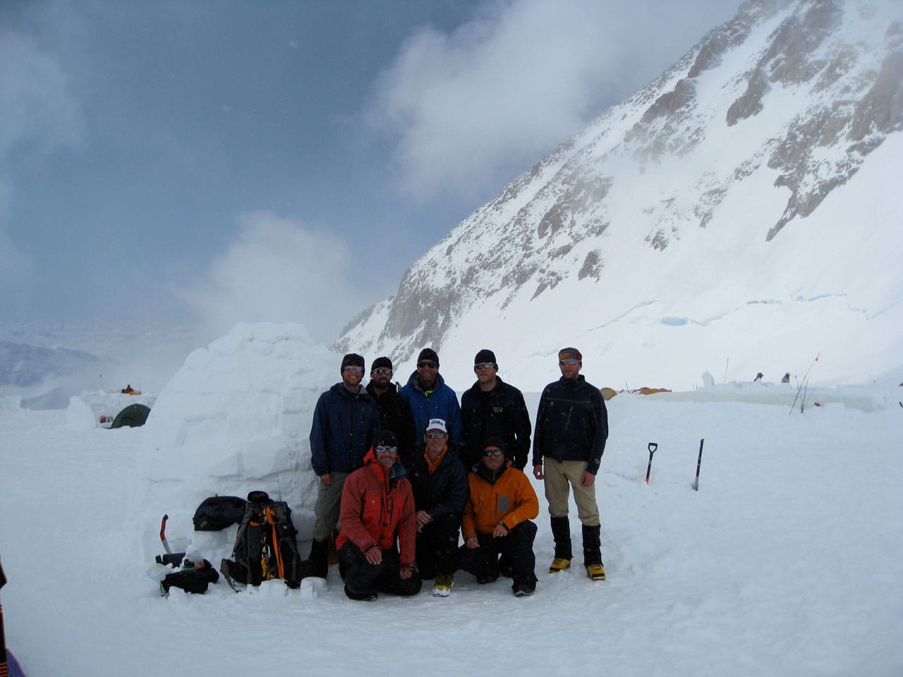 Right after breakfast we started work on an igloo. Dan and I primarily quaried while most of the others did construction. The rings of blocks forming the igloo spiral up, and the entrance is through an arched hallway (designed and constructed by Brian). Wes dug out the inside, such that any of us can stand up inside (and I can't touch the top-center even with my arm out-stretched), with a nice bench to sit on around the inside. Its freaking cold in the igloo, but five of us comfortably ate lunch in there. Several other climbers dropped by to take pictures and one lady even asked if she could tour the inside. Some high-ish winds are expected tonight, so if the igloo survives, it should be good for the remainder of the season. We got some passerby to take a group photo of us in front of the igloo. Brian is working on an "RMI" fixture to put at the entrance. Time for a nap.