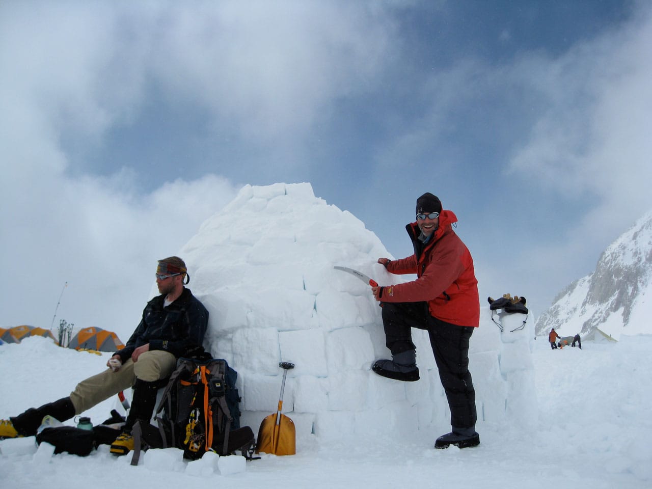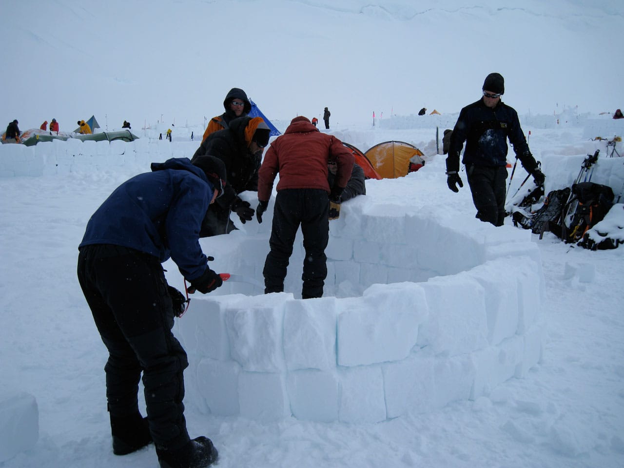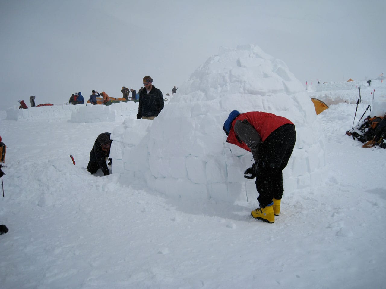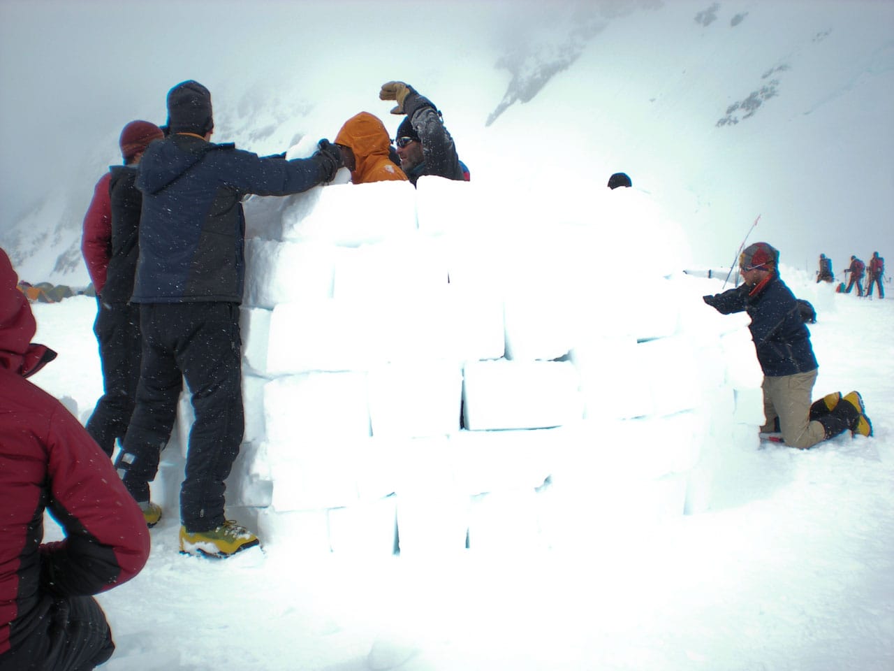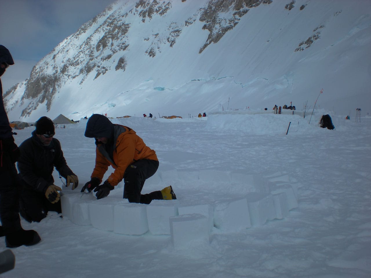 Right after breakfast we started work on an igloo. Dan and I primarily quaried while most of the others did construction. The rings of blocks forming the igloo spiral up, and the entrance is through an arched hallway (designed and constructed by Brian). Wes dug out the inside, such that any of us can stand up inside (and I can't touch the top-center even with my arm out-stretched), with a nice bench to sit on around the inside. Its freaking cold in the igloo, but five of us comfortably ate lunch in there. Several other climbers dropped by to take pictures and one lady even asked if she could tour the inside. Some high-ish winds are expected tonight, so if the igloo survives, it should be good for the remainder of the season. We got some passerby to take a group photo of us in front of the igloo. Brian is working on an "RMI" fixture to put at the entrance. Time for a nap.