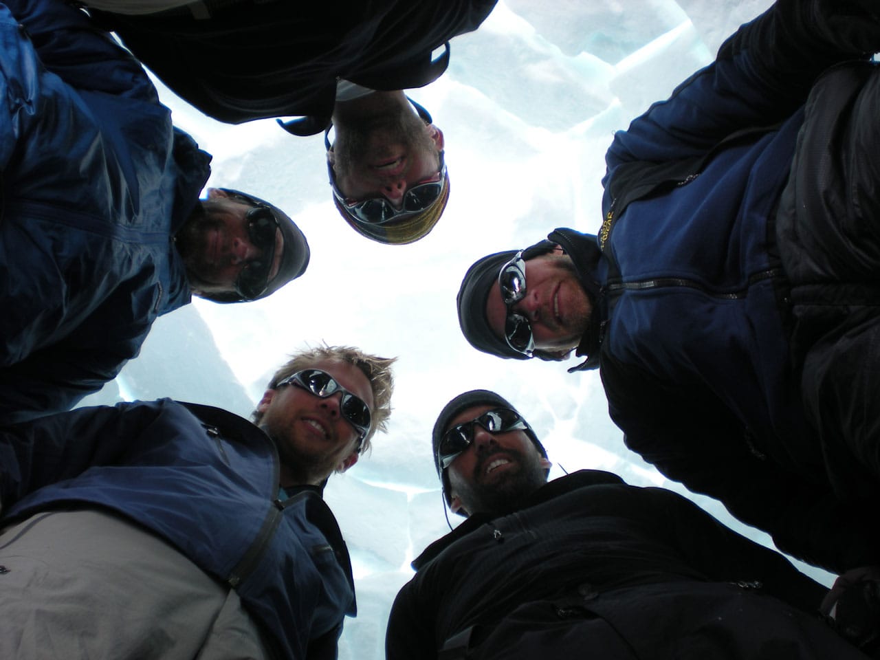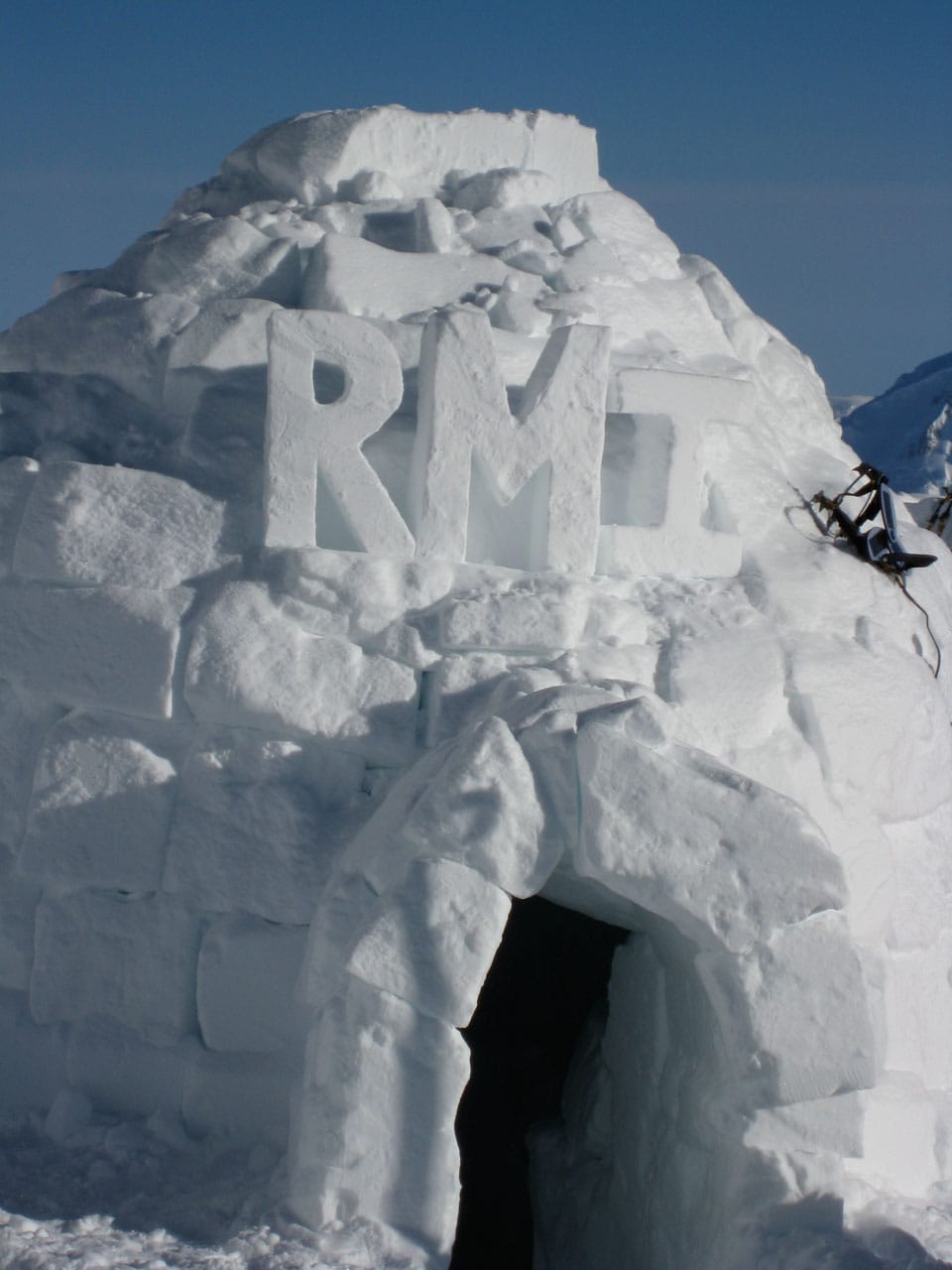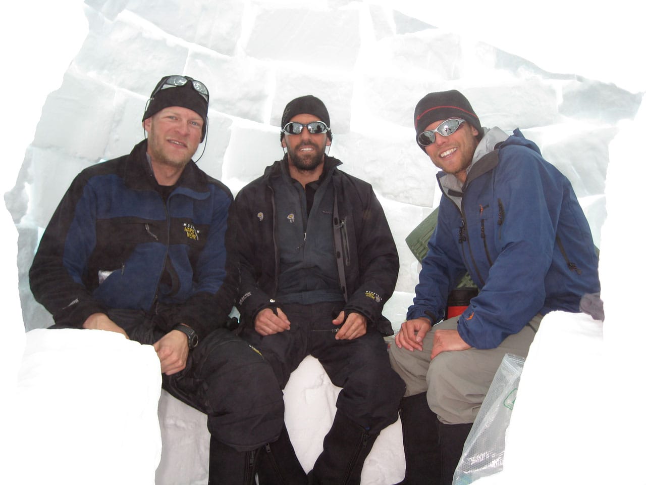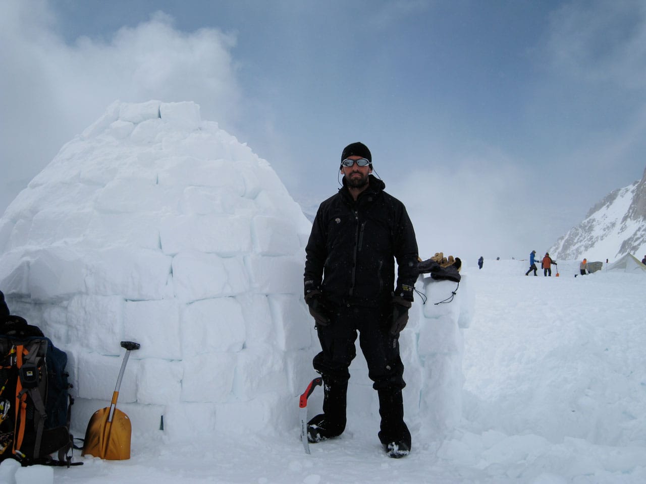 Right after breakfast we started work on an igloo. Dan and I primarily quaried while most of the others did construction. The rings of blocks forming the igloo spiral up, and the entrance is through an arched hallway (designed and constructed by Brian). Wes dug out the inside, such that any of us can stand up inside (and I can't touch the top-center even with my arm out-stretched), with a nice bench to sit on around the inside. Its freaking cold in the igloo, but five of us comfortably ate lunch in there. Several other climbers dropped by to take pictures and one lady even asked if she could tour the inside. Some high-ish winds are expected tonight, so if the igloo survives, it should be good for the remainder of the season. We got some passerby to take a group photo of us in front of the igloo. Brian is working on an "RMI" fixture to put at the entrance. Time for a nap.