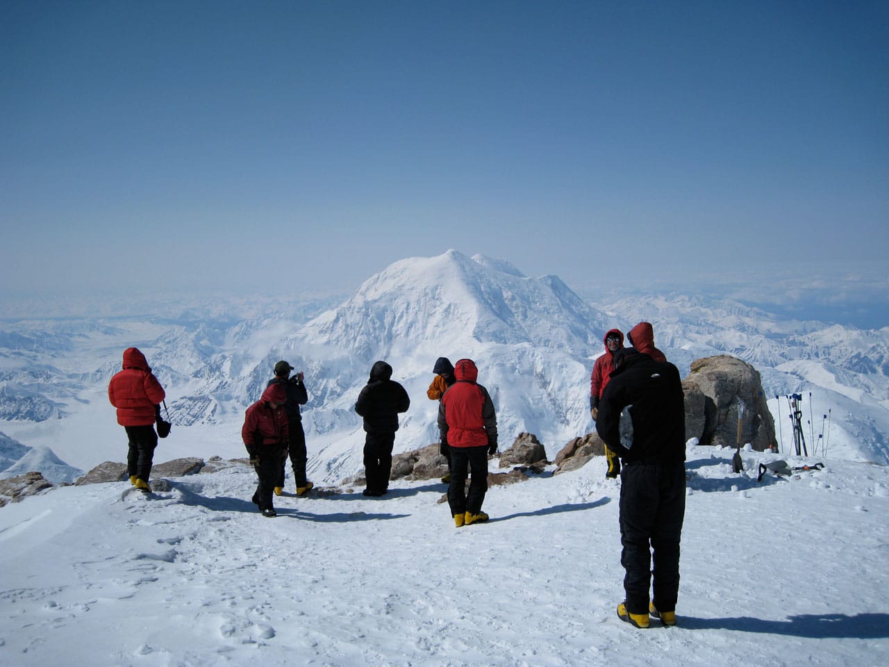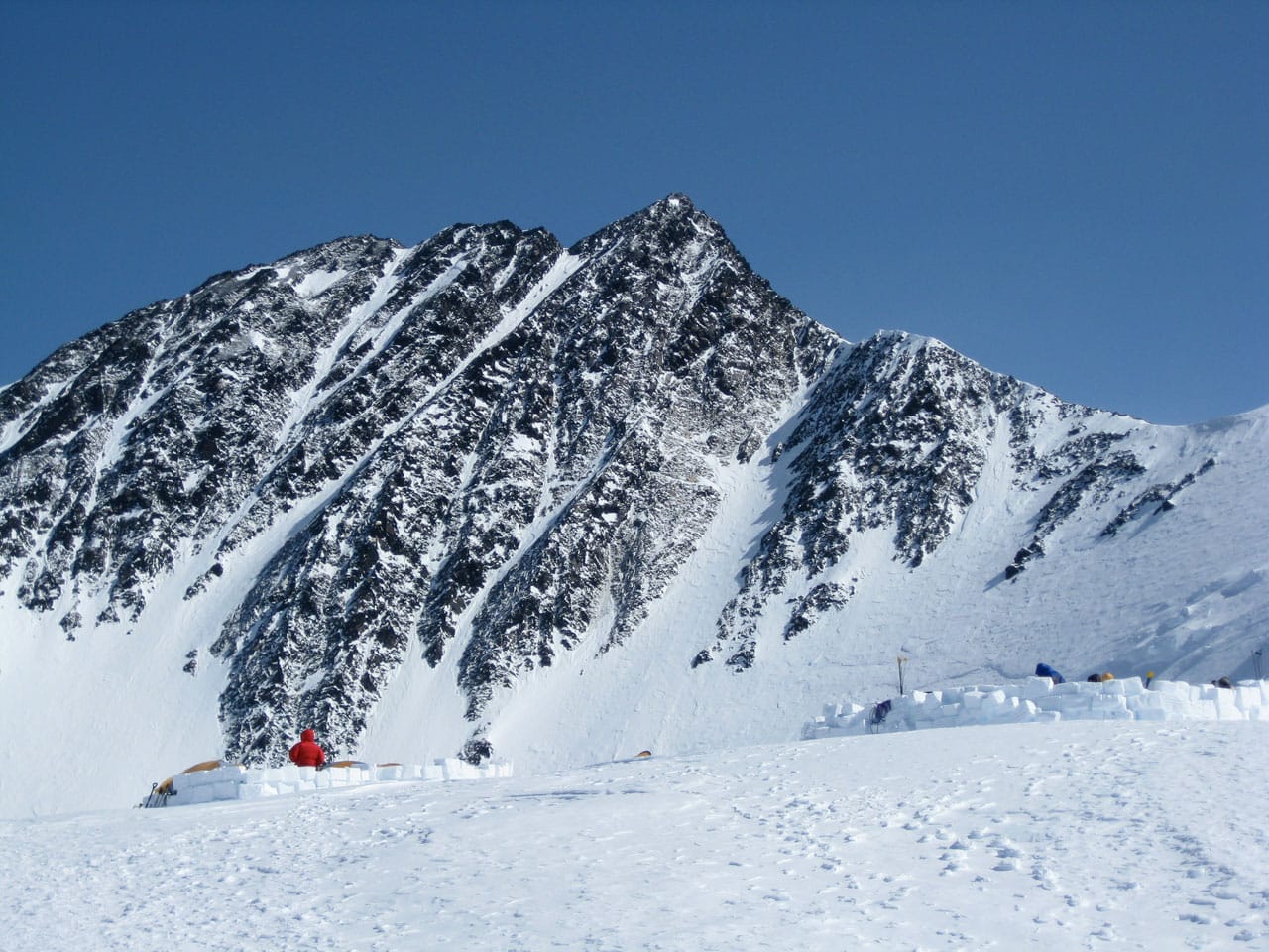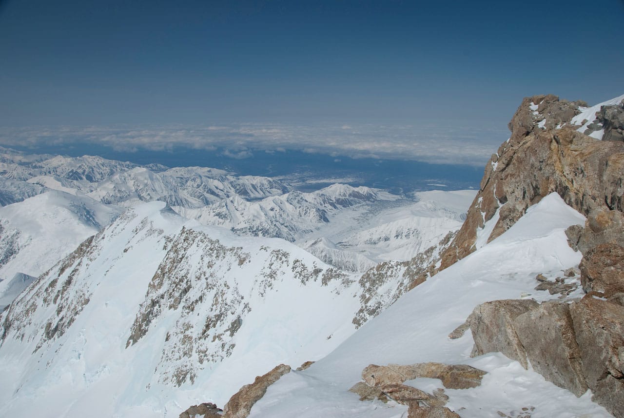 The hike across the West Buttress proper, yesterday, was amazing. Parts of it were only a foot wide with a multi-thousand foot drop on either side, and that's why we used several running belays. Where we couldn't drive in pickets, we slung the rope over rocks. It was a bit of a hassle, but the benefit in case of a fall was obvious.