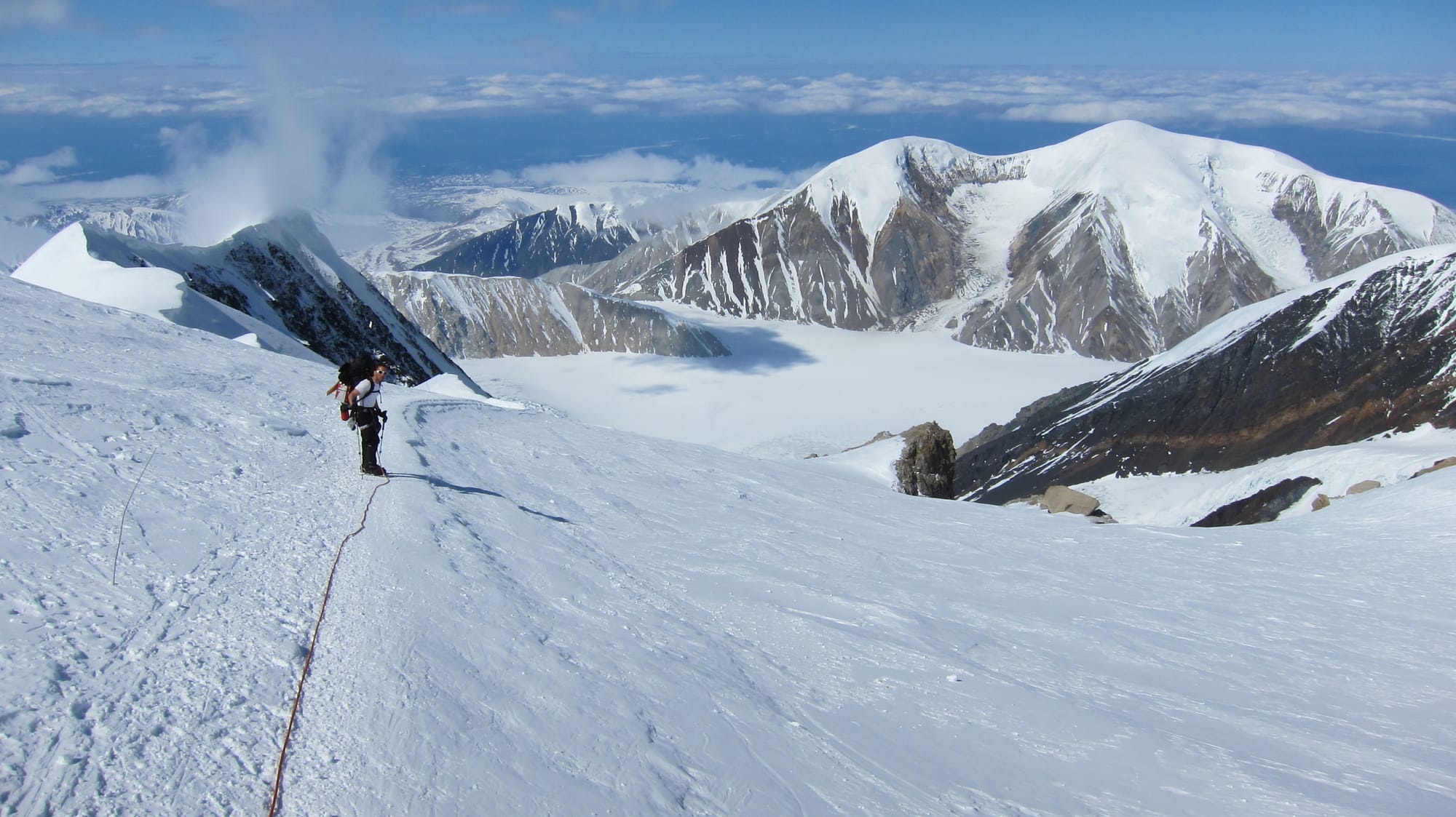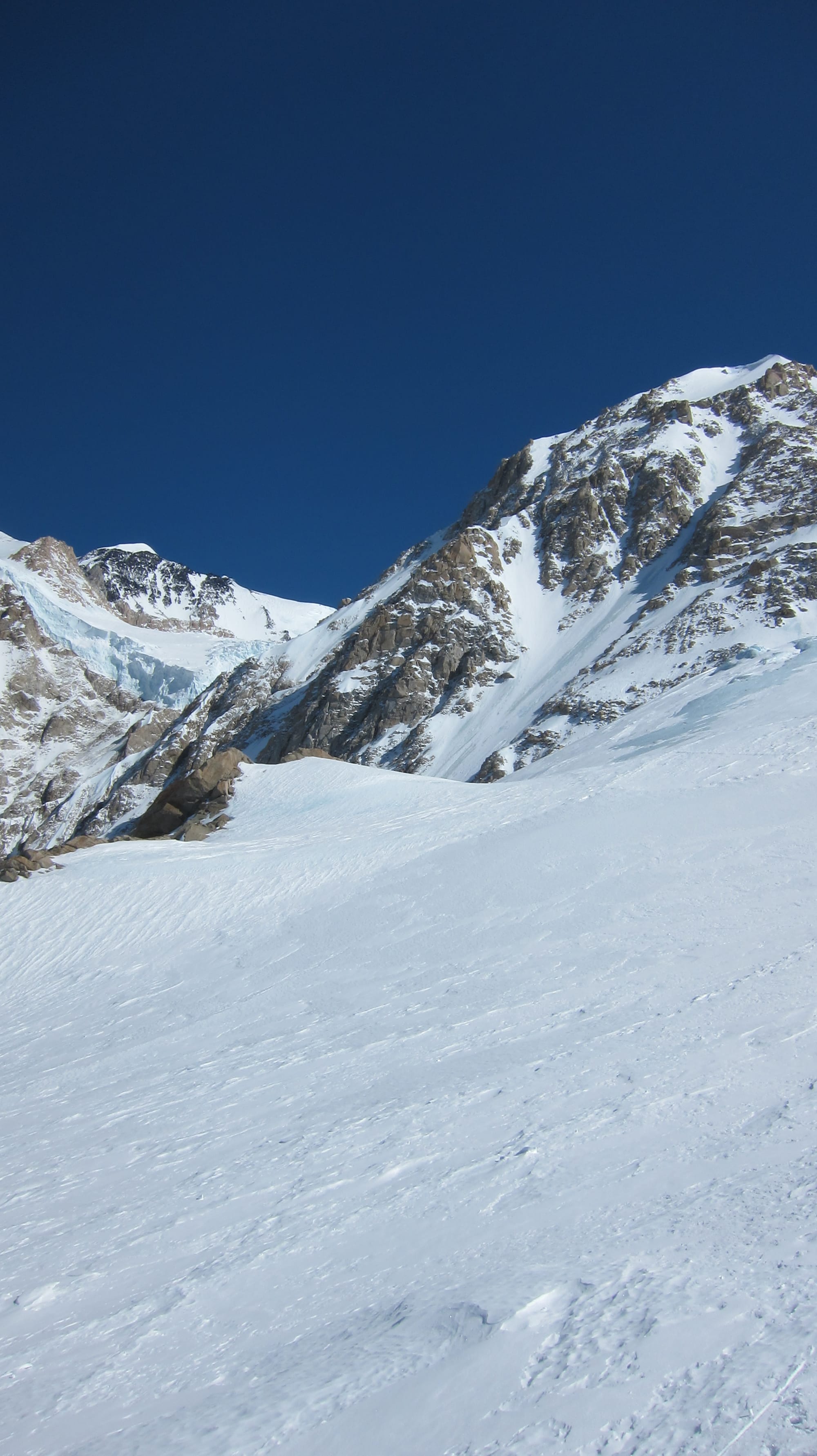 13:15 - Suitably late in the day, with the sun beating down on us in full, we started the slog up Motorcycle Hill, finally wearing crampons. Snowshoes are a thing of the past.