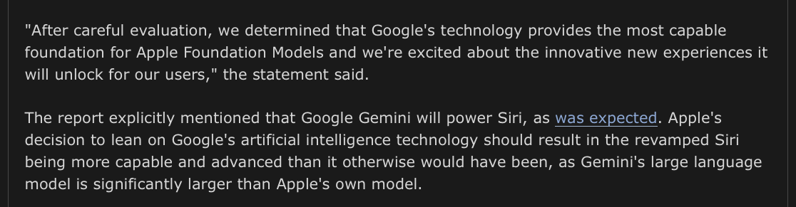 "After careful evaluation, we determined that Google's technology provides the most capable foundation for Apple Foundation Models and we're excited about the innovative new experiences it will unlock for our users."
