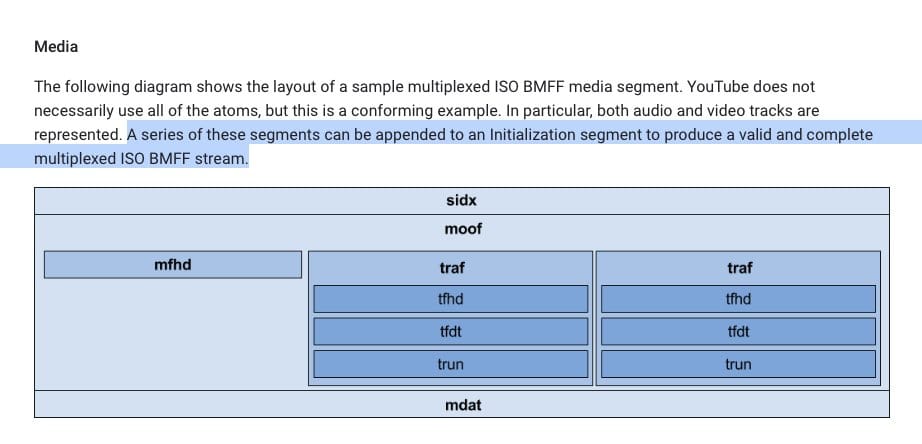 Okay. Maybe I'm finally figuring this out now. "A series of these segments can be appended to an Initialization segment to produce a valid and complete multiplexed ISO BMFF stream." So, my full-and-complete MP4 media files (probably) aren't correct. They should instead be these SDIX + MOOF + MDAT things. Interesting.
