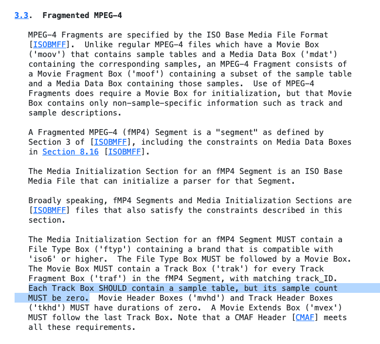 "Each Track Box SHOULD contain a sample table, but its sample count MUST be zero." So, even if I can write out these fragmented MP4 files, my initialization segment (with a single video frame to make AVAssetWriter happy) is wrong according to the spec.