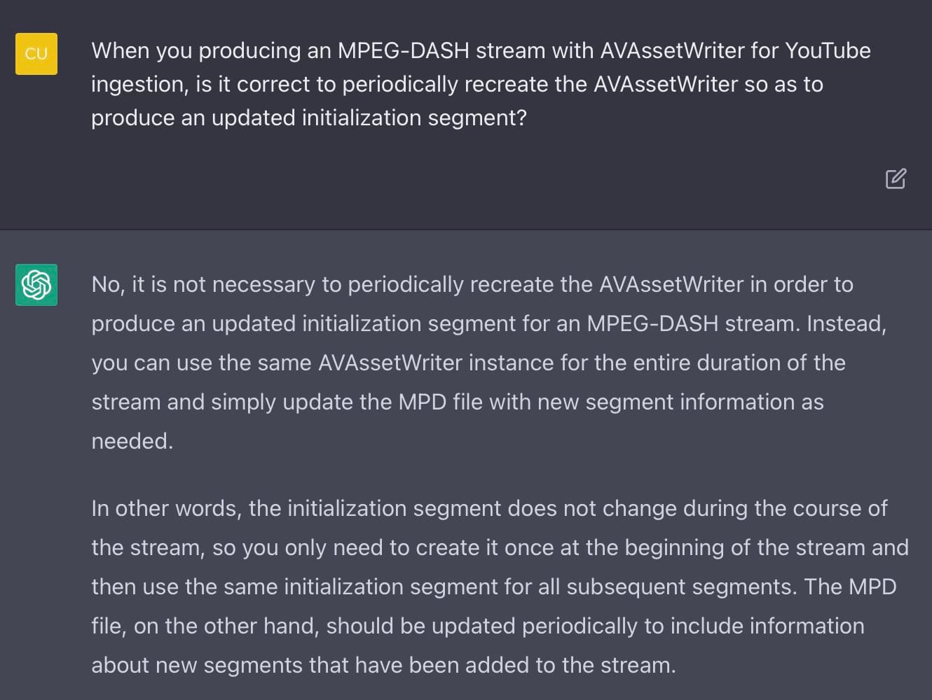 Is ChatGPT just telling me what I want to hear? If this is correct, I think I’m finally out of ideas. I mean, the one thing I can’t test is creating and pushing a multiplexed stream. Maybe I’ll look at some example MPDs and segmented media files and look for differences.