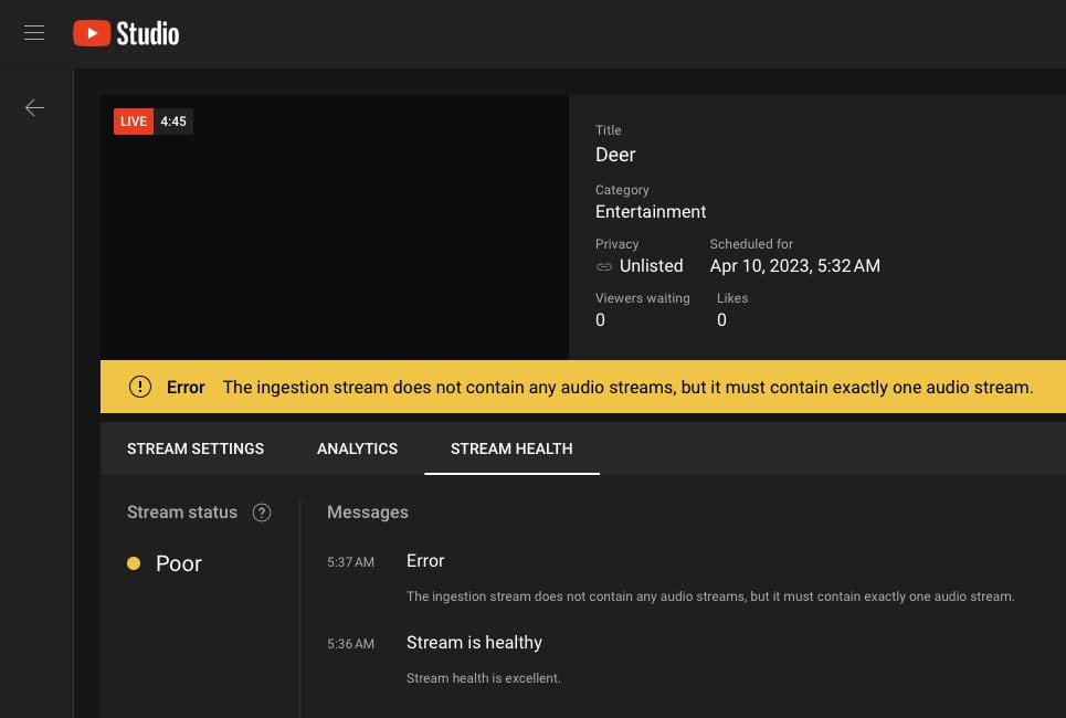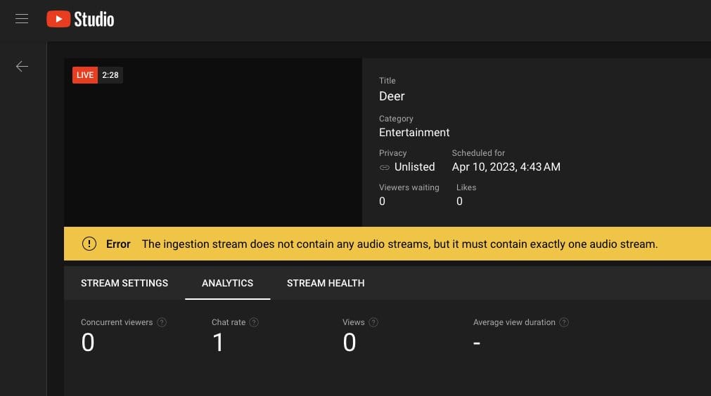 Progress! "The ingestion stream does not contain any audio streams, but it must contain exactly one audio stream."
