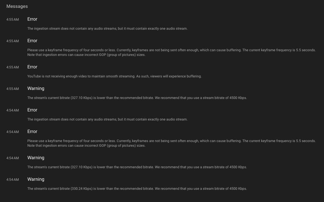 I'm going to ignore the audio error for now and instead address the keyframe frequency and see if that helps. I'll also bump up the encoder bitrate next.